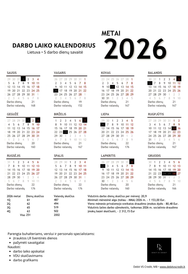 Parengėme 2026 metų darbo laiko kalendorių, skirtą buhalteriams, įmonėms ir personalo specialistams. Kalendorius pritaikytas 5 darbo dienų savaitei ir apima visas Lietuvos Respublikos šventines dienas.